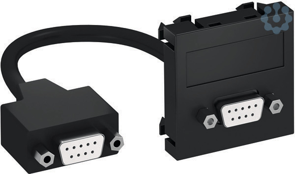 Multimediaträger mit einer D-Sub9 Anschlussbuchse, Kabelauslass gerade, mit Beschriftungsfeld, kurzes D-Sub9 Anschlusskabel (RS232) in Ausführung Buchse-Buchse. Träger mit Rastbefestigung, geeignet für den waagerechten und senkrechten Einbau in die Systemumgebung.