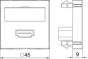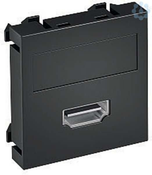 Multimediaträger mit einer HDMI Anschlussbuchse, Kabelauslass gerade, mit Beschriftungsfeld, HDMI Buchse mit Schraubanschluss. Trägerplatte mit Rastbefestigung, geeignet für den waagerechten und senkrechten Einbau in die Systemumgebung.