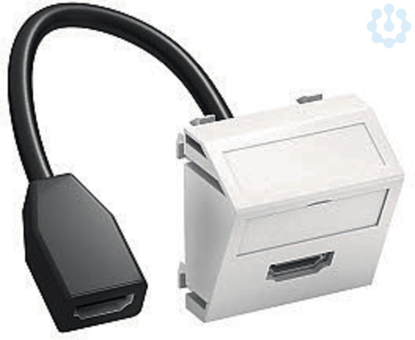 Multimediaträger mit einer HDMI Anschlussbuchse, Kabelauslass schräg, mit Beschriftungsfeld, kurzes HDMI Anschlusskabel in Ausführung Buchse-Buchse. Trägerplatte mit Rastbefestigung, geeignet für den waagerechten und senkrechten Einbau in die Systemumgebung.