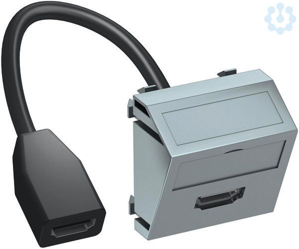 Multimediaträger mit einer HDMI Anschlussbuchse, Kabelauslass schräg, mit Beschriftungsfeld, kurzes HDMI Anschlusskabel in Ausführung Buchse-Buchse. Trägerplatte mit Rastbefestigung, geeignet für den waagerechten und senkrechten Einbau in die Systemumgebung.