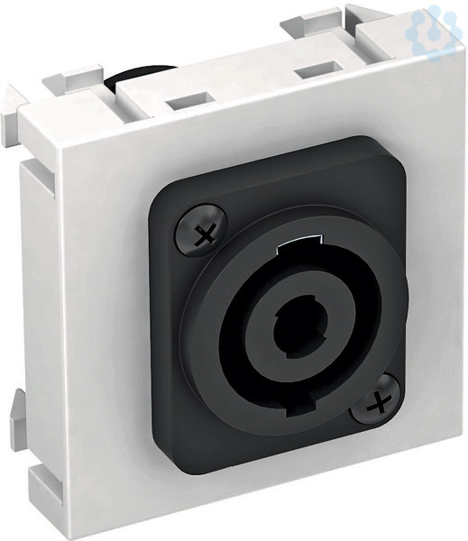 Multimediaträger mit einer Speakon-Anschlussbuchse, Kabelauslass gerade, ohne Beschriftungsfeld, Speakon-Buchse 4-polig mit Schraubanschluss. Trägerplatte mit Rastbefestigung, geeignet für den waagerechten und senkrechten Einbau in die Systemumgebung.