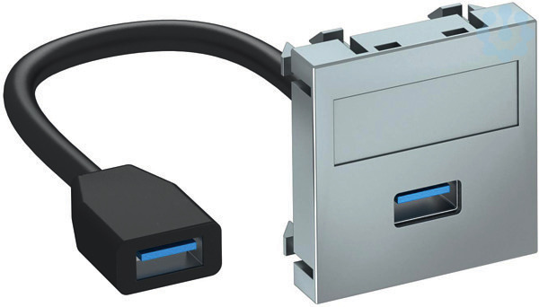 Multimediaträger mit einer USB 3.0 Anschlussbuchse, Kabelauslass gerade, mit Beschriftungsfeld, kurzes USB 3.0 Typ A Anschlusskabel in Ausführung Buchse-Buchse. Trägerplatte mit Rastbefestigung, geeignet für den waagerechten und senkrechten Einbau in die Systemumgebung.