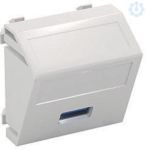Multimediaträger mit einer USB 3.0 Anschlussbuchse, Kabelauslass schräg, mit Beschriftungsfeld, USB 3.0 Buchse Typ A mit Schraubanschluss. Trägerplatte mit Rastbefestigung, geeignet für den waagerechten und senkrechten Einbau in die Systemumgebung.