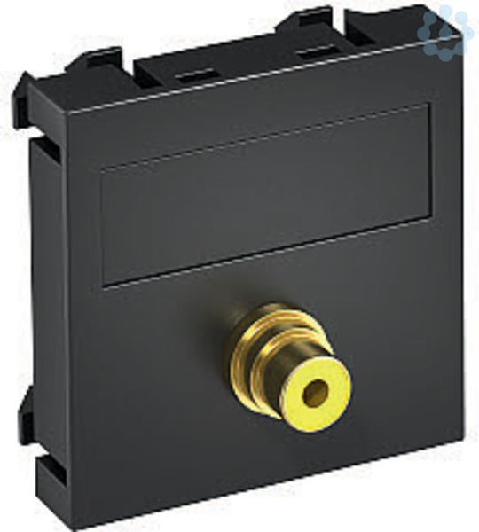 Multimediaträger mit einer Cinch Anschlussbuchse für Composite Video, Kabelauslass gerade, mit Beschriftungsfeld, Cinch Kupplung (RCA) in Ausführung Buchse-Buchse, Farbkodierung gelb. Trägerplatte mit Rastbefestigung, geeignet für den waagerechten und senkrechten Einbau in die Systemumgebung.