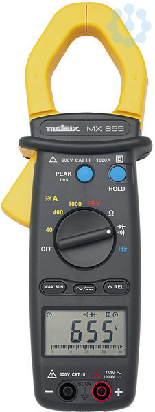 MX655, Technische Daten: 4.000 Punkte-Anzeige Bargraph mit 42 Segmenten Umschließungsdurchmesser von 40 mm AC-Strom: 0,05 A bis 1000 A RMS DC-Strom: 0,1 A bis 1000 A AC-Spannung: 0,5 V bis 750 V DC-Spannung: 0,2 V bis 1000 V Widerstand: 0,2 ? bis 4 k? Frequenz: 20 Hz bis 10 kHz (für A) / 10 Hz bis 10 kHz (für V) akustische Durchgangsprüfung, Diodenprüfung Installationskategorie: EN 61010 600 V CAT III Funktionen: HOLD (Einfrieren der Anzeige) PEAK (Erfassung von Signalen von 1 ms) MIN-MAX REL (relative Messung)