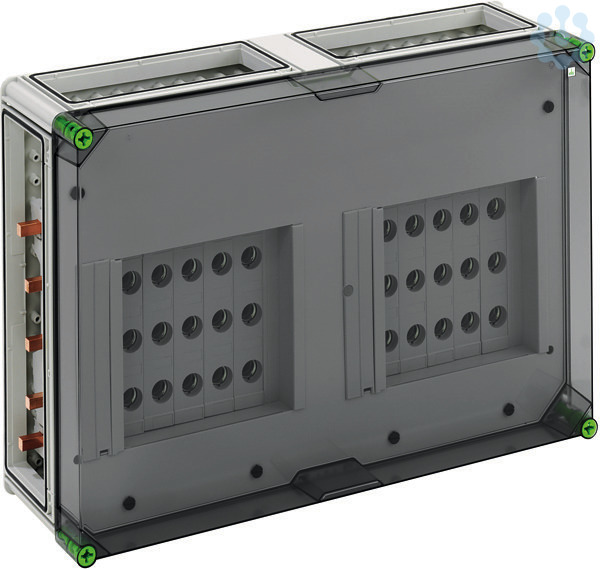 NEOZED(R)-Reiter-Sicherungsgehäuse mit zusätzlichem Anschlussraum, Industrie Qualität, 10 x 3-polige D02-Reiter-Sicherungssockel, E 18-Gewinde, Bemessungsstrom 63 A, Schraubanschluss 1,5-25qmm, auf Sammelschiene 5-polig, mit 5 Sammelschienenklemmen 16-70qmm, N-Klemmen 1,5-16qmm, PE-Klemmen 1,5-16qmm, 4 x Gehäuseverbinder (GGV), auf Sammelschienensystem 630 A, mit transparentem Deckel