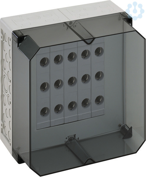 NEOZED(R)-Reiter-Sicherungsgehäuse, Industrie Qualität, 5 x 3-polige D02-Reiter-Sicherungssockel, E 18-Gewinde, Bemessungsstrom 63 A, Schraubanschluss 1,5-25qmm, auf Sammelschiene 5-polig, N-Klemmen 1,5-16qmm, PE-Klemmen 1,5-16qmm, auf Sammelschienensystem 250 A, mit transparentem Deckel