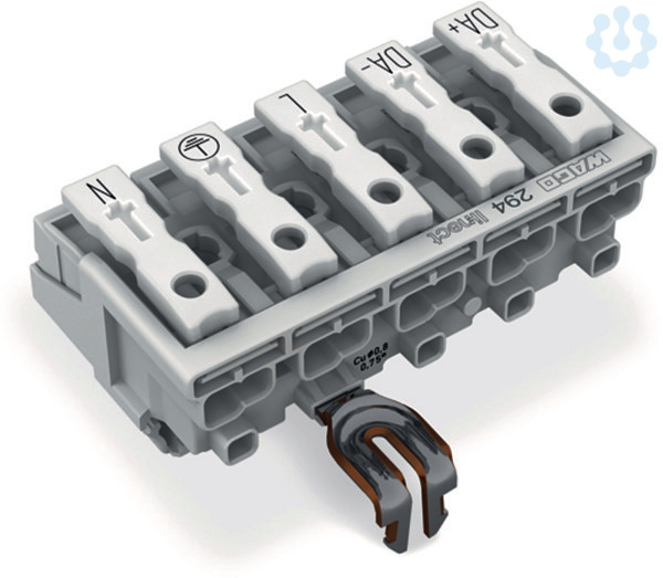 Leuchtenanschlussklemme. Drücker extern. für Linect®. mit PE-Rastkontakt. DA+ DA- L PE N. 5-polig. Kod. I. Leuchtenseite: für eindrähtige Leiter. Inst.-Seite: für alle Leiterarten. max. 2,5 mm². Umgebungstemperatur max. 85 °C (T85). 2,50 mm². weiß