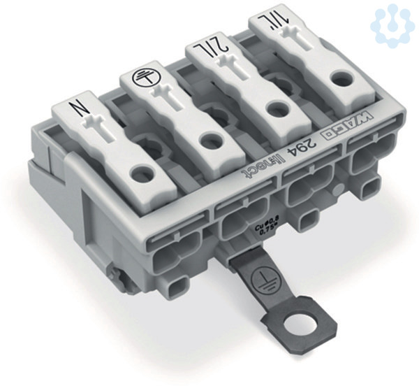 Leuchtenanschlussklemme. Drücker extern. für Linect®. mit PE-Schraubkontakt. 1/L´-2/L-PE-N. 4-polig. Kod. A. Leuchtenseite: für eindrähtige Leiter. Inst.-Seite: für alle Leiterarten. max. 2,5 mm². Umgebungstemperatur max. 85 °C (T85). 2,50 mm². weiß