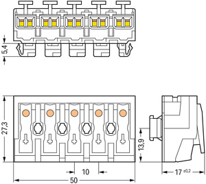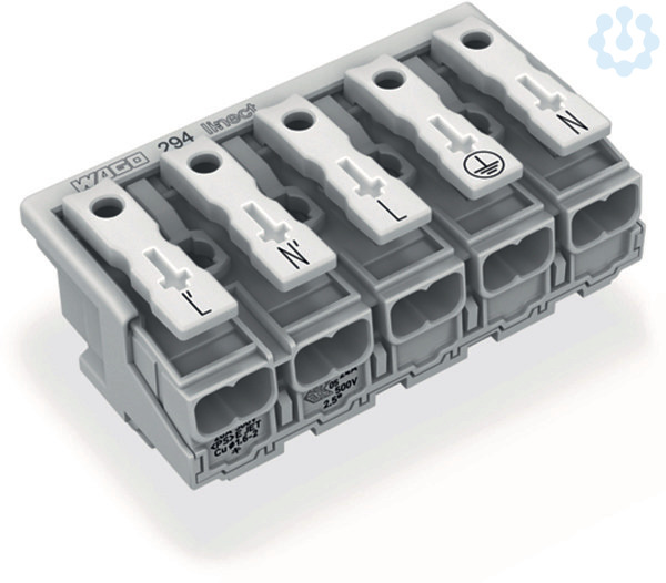 Leuchtenanschlussklemme. Drücker extern. für Linect®. ohne PE-Kontakt. L3-L2-L1-PE-N. 5-polig. Kod. A. Leuchtenseite: für eindrähtige Leiter. Inst.-Seite: für alle Leiterarten. max. 2,5 mm². Umgebungstemperatur max. 85 °C (T85). 2,50 mm². weiß