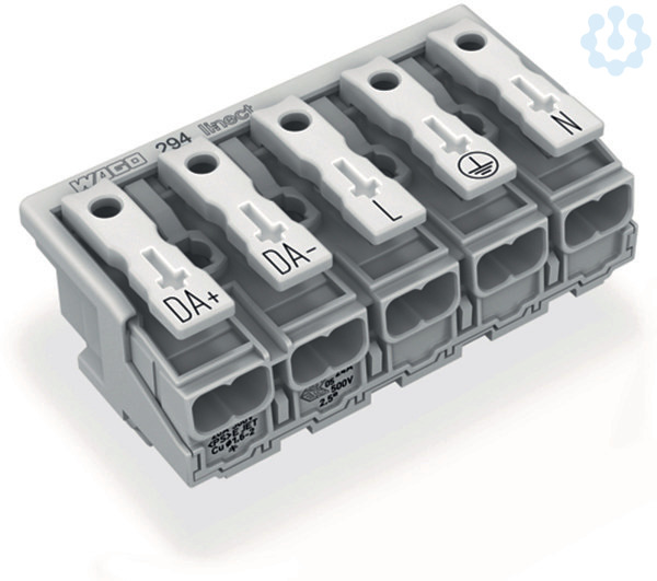 Leuchtenanschlussklemme. Drücker extern. für Linect®. ohne PE-Kontakt. DA+ DA- L PE N. 5-polig. Kod. I. Leuchtenseite: für eindrähtige Leiter. Inst.-Seite: für alle Leiterarten. max. 2,5 mm². Umgebungstemperatur max. 85 °C (T85). 2,50 mm². weiß