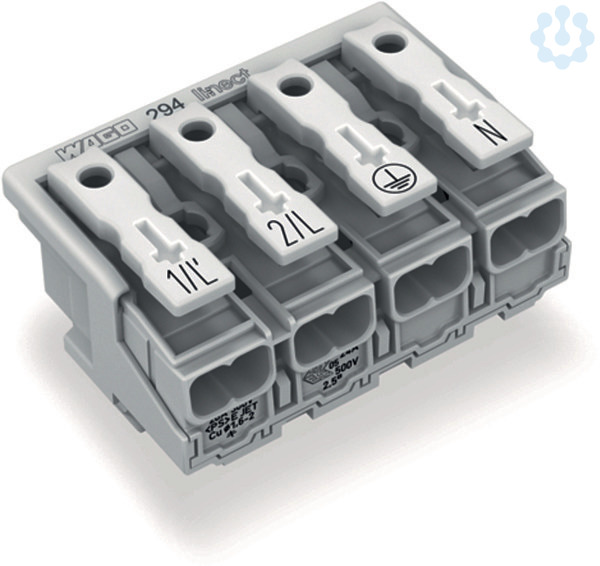 Leuchtenanschlussklemme. Drücker extern. für Linect®. ohne PE-Kontakt. 1/L´-2/L-PE-N. 4-polig. Kod. A. Leuchtenseite: für eindrähtige Leiter. Inst.-Seite: für alle Leiterarten. max. 2,5 mm². Umgebungstemperatur max. 85 °C (T85). 2,50 mm². weiß
