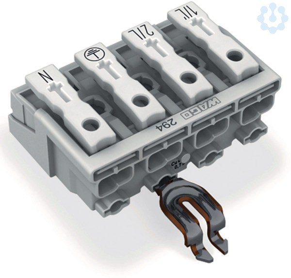 Leuchtenanschlussklemme. Drücker extern. mit abgewinkeltem PE-Rastkontakt. 1/L´-2/L-PE-N. 4-polig. Leuchtenseite: für eindrähtige Leiter. Inst.-Seite: für alle Leiterarten. max. 2,5 mm². Umgebungstemperatur max. 85 °C (T85). 2,50 mm². weiß