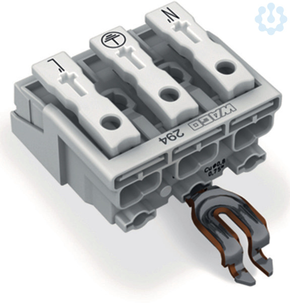 Leuchtenanschlussklemme. Drücker extern. mit abgewinkeltem PE-Rastkontakt. 3-polig. Leuchtenseite: für eindrähtige Leiter. Inst.-Seite: für alle Leiterarten. max. 2,5 mm². Umgebungstemperatur max. 85 °C (T85). 2,50 mm². weiß