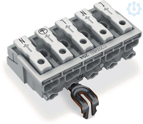 Leuchtenanschlussklemme. Drücker extern. mit PE-Rastkontakt. L´-N´-L-PE-N. 5-polig. Leuchtenseite: für eindrähtige Leiter. Inst.-Seite: für alle Leiterarten. max. 2,5 mm². Umgebungstemperatur max. 85 °C (T85). 2,50 mm². weiß