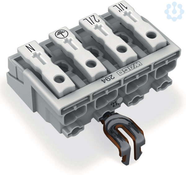 Leuchtenanschlussklemme. Drücker extern. mit PE-Rastkontakt. 1/L´-2/L-PE-N. 4-polig. Leuchtenseite: für eindrähtige Leiter. Inst.-Seite: für alle Leiterarten. max. 2,5 mm². Umgebungstemperatur max. 85 °C (T85). 2,50 mm². weiß