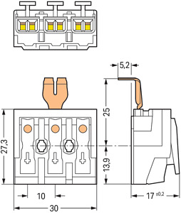 Leuchtenanschlussklemme. Drücker extern. mit PE-Rastkontakt. 3-polig. Leuchtenseite: für eindrähtige Leiter. Inst.-Seite: für alle Leiterarten. max. 2,5 mm². Umgebungstemperatur max. 85 °C (T85). 2,50 mm². weiß
