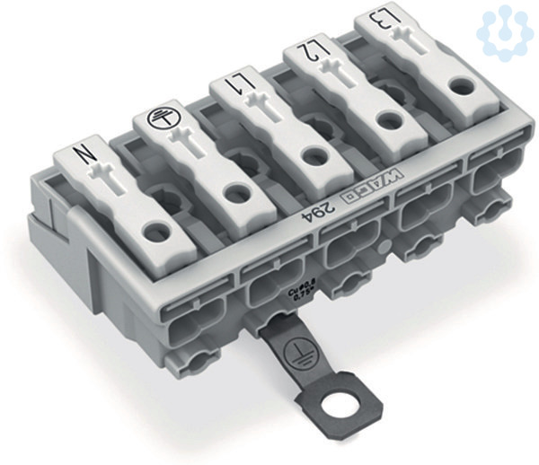Leuchtenanschlussklemme. Drücker extern. mit PE-Schraubkontakt. L3-L2-L1-PE-N. 5-polig. Leuchtenseite: für eindrähtige Leiter. Inst.-Seite: für alle Leiterarten. max. 2,5 mm². Umgebungstemperatur max. 85 °C (T85). 2,50 mm². weiß
