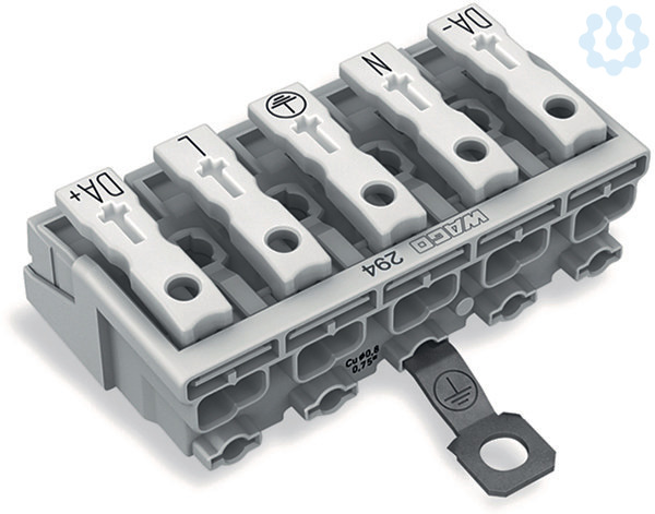 Leuchtenanschlussklemme. Drücker extern. mit PE-Schraubkontakt. 5-polig. Leuchtenseite: für eindrähtige Leiter. Inst.-Seite: für alle Leiterarten. max. 2,5 mm². Umgebungstemperatur max. 85 °C (T85). 2,50 mm². weiß