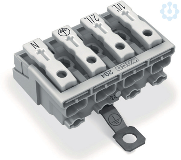 Leuchtenanschlussklemme. Drücker extern. mit PE-Schraubkontakt. 1/L´-2/L-PE-N. 4-polig. Leuchtenseite: für eindrähtige Leiter. Inst.-Seite: für alle Leiterarten. max. 2,5 mm². Umgebungstemperatur max. 85 °C (T85). 2,50 mm². weiß