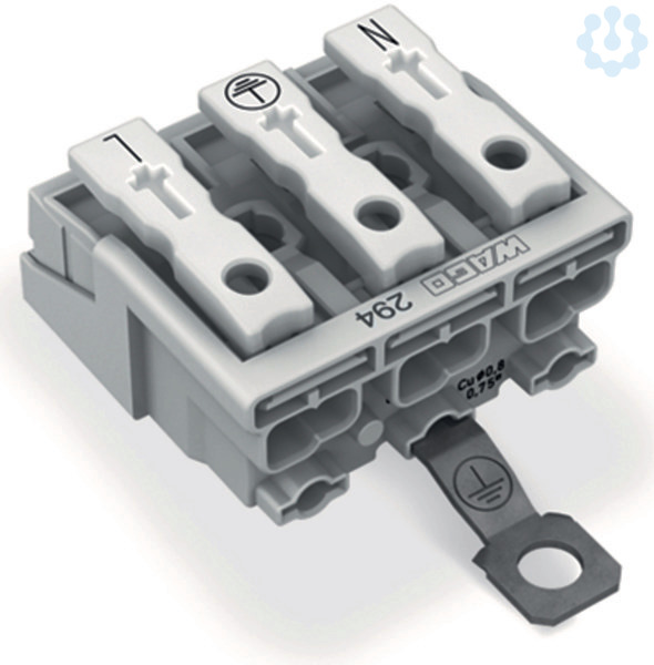 Leuchtenanschlussklemme. Drücker extern. mit PE-Schraubkontakt. N-PE-L. 3-polig. Leuchtenseite: für eindrähtige Leiter. Inst.-Seite: für alle Leiterarten. max. 2,5 mm². Umgebungstemperatur max. 85 °C (T85). 2,50 mm². weiß