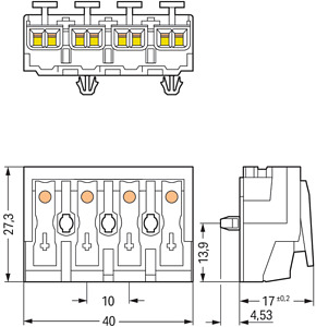Leuchtenanschlussklemme. Drücker extern. ohne PE-Kontakt. 4-polig. Leuchtenseite: für eindrähtige Leiter. Inst.-Seite: für alle Leiterarten. max. 2,5 mm². Umgebungstemperatur max. 85 °C (T85). 2,50 mm². weiß