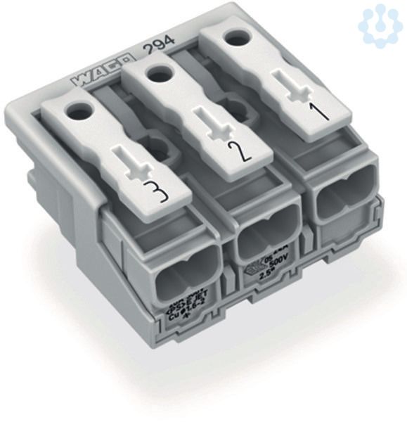 Leuchtenanschlussklemme. Drücker extern. ohne PE-Kontakt. 3-polig. Leuchtenseite: für eindrähtige Leiter. Inst.-Seite: für alle Leiterarten. max. 2,5 mm². Umgebungstemperatur max. 85 °C (T85). 2,50 mm². weiß
