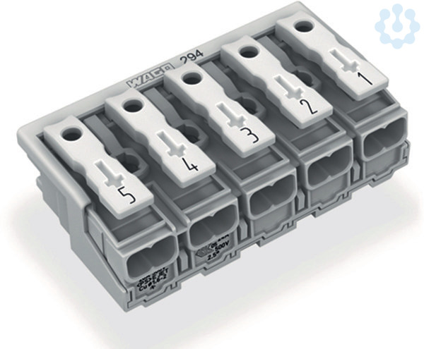 Leuchtenanschlussklemme. Drücker extern. ohne PE-Kontakt. 5-polig. Leuchtenseite: für eindrähtige Leiter. Inst.-Seite: für alle Leiterarten. max. 2,5 mm². Umgebungstemperatur max. 85 °C (T85). 2,50 mm². weiß