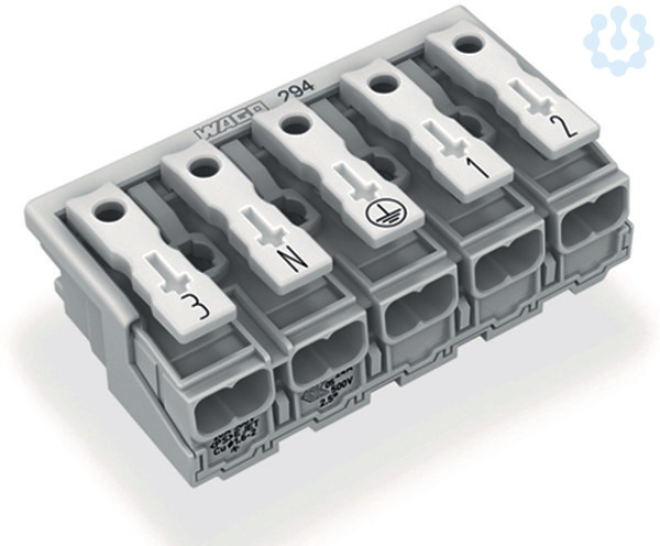 Leuchtenanschlussklemme. Drücker extern. ohne PE-Kontakt. 5-polig. Leuchtenseite: für eindrähtige Leiter. Inst.-Seite: für alle Leiterarten. max. 2,5 mm². Umgebungstemperatur max. 85 °C (T85). 2,50 mm². weiß