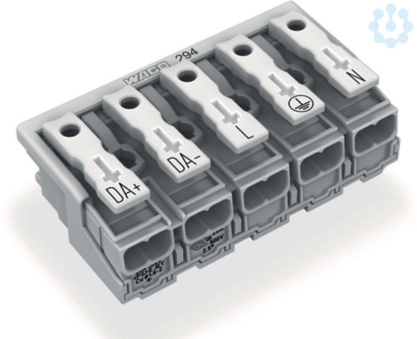 Leuchtenanschlussklemme. Drücker extern. ohne PE-Kontakt. DA+ DA- L PE N. 5-polig. Leuchtenseite: für eindrähtige Leiter. Inst.-Seite: für alle Leiterarten. max. 2,5 mm². Umgebungstemperatur max. 85 °C (T85). 2,50 mm². weiß