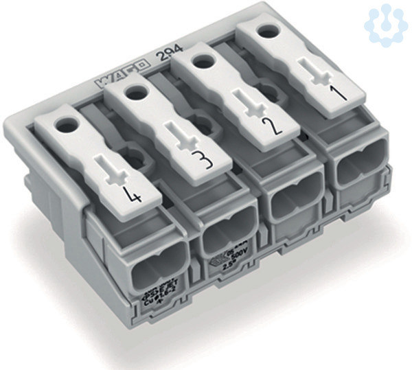 Leuchtenanschlussklemme. Drücker extern. ohne PE-Kontakt. 4-polig. Leuchtenseite: für eindrähtige Leiter. Inst.-Seite: für alle Leiterarten. max. 2,5 mm². Umgebungstemperatur max. 85 °C (T85). 2,50 mm². weiß