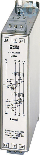Netzentstörfilter I:50A. 3-ph. 1-stufig U:3x500V AC Buchform