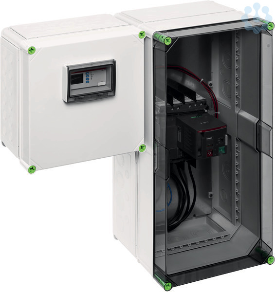NA-Schutzgehäuse als Freischaltstelle nach VDE-AR-N 4105 für Photovoltaikanlagen und Blockheizkraftwerke, Bemessungsstrom des Leistungsschalters 250 A, ICu: 50 kA (415V), LS/I-Auslöser Einstellbereich: 100-250 A, Bemessungsleistung: 150 kVA, Lieferung erfolgt in Baugruppen zur individuellen Anordnung vor Ort, einfache Kombination durch Stecksystem und beiligendes Zubehör, inkl. mit Flanschset GFS 14-m und zwei Flanschen GFL 381-m (3xM63/M50/M40) zum Verschließen der Gehäuseseiten, individuell erweiterbar durch weitere GTi-Gehäuselösungen