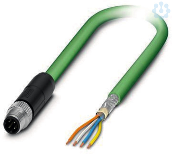 Netzwerkkabel, PROFINET CAT5 (100 MBit/s), EtherCAT® CAT5 (100 MBit/s), 4-polig, PUR/FRNC halogenfrei, grün RAL 6018, geschirmt (Advanced Shielding Technology), Stecker gerade M8 / IP67, Kodierung: D, auf freies Leitungsende, Kabellänge: 5 m