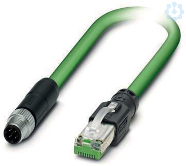 Netzwerkkabel, PROFINET CAT5 (100 MBit/s), EtherCAT® CAT5 (100 MBit/s), 4-polig, PUR/FRNC halogenfrei, grün RAL 6018, geschirmt (Advanced Shielding Technology), Stecker gerade M8 / IP67, Kodierung: D, auf Stecker gerade RJ45 / IP20, Kabellänge: 1 m