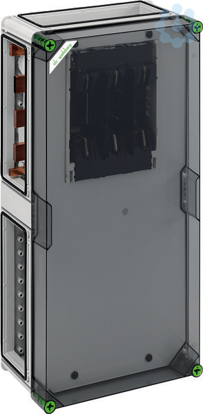 NH-Reiter-Sicherungsgehäuse, Industrie Qualität, 1 x NH 1-Reiter-Sicherungsunterteil, Schraubanschluss M10, Abgang unten, auf Sammelschiene 5-polig, N-Klemme 16-120qmm, PE-Klemme 16-120qmm, 4 x Gehäuseverbinder (GGV), auf Sammelschienensystem 250 A, mit transparentem Deckel
