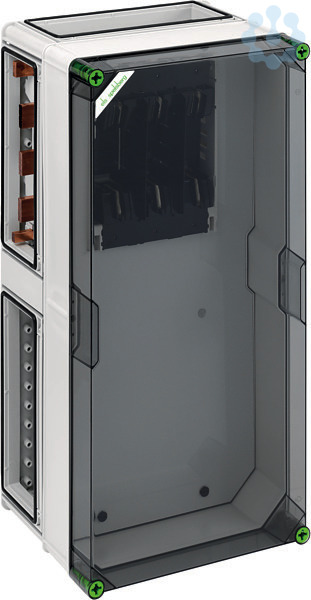 NH-Reiter-Sicherungsgehäuse, Industrie Qualität, 1 x NH 2-Reiter-Sicherungsunterteil, Schraubanschluss M10, Abgang unten, auf Sammelschiene 5-polig, N-Klemme 16-120qmm, PE-Klemme 16-120qmm, 4 x Gehäuseverbinder (GGV), auf Sammelschienensystem 630 A, mit transparentem Deckel