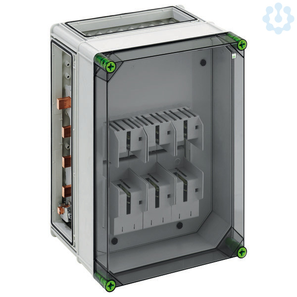 NH-Reitersicherungsgehäuse GSS 3215-400 Plus, NH-Reiter-Sicherungsgehäuse mit zusätzlichem Anschlussraum - Industrie Qualität -, 1 x NH 2-Reiter-Sicherungsunterteil, Bemessungsstrom 400 A, Schraubanschluss M10, Abgang oben, auf Sammelschiene 5-polig, N-Klemme 16 - 120 mm², PE-Klemme 16 - 120 mm², 4 x Gehäuseverbinder (GGV), Schutzart IP65, Schlagfestigkeit IK08, Schutzklasse II, Bemessungsisolationsspannung Ui 690VAC/DC, Halogenfrei, 320 x 440 x 254, auf Sammelschienensystem 400 A, mit transparentem Deckel,