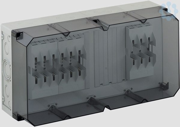 NH-Reiter-Sicherungsgehäuse, Industrie Qualität, 3 x NH 00-Reiter-Sicherungsunterteil, Bemessungsstrom 100 A, Schellenanschluss 1,5-70qmm, Abgang oben, auf Sammelschiene 5-polig, mit 5 Sammelschienenklemmen 16-70qmm, N-Klemmen 4-35qmm, PE-Klemmen 4-35qmm, mit Isolierstopfen, auf Sammelschienensystem 250 A, mit transparentem Deckel