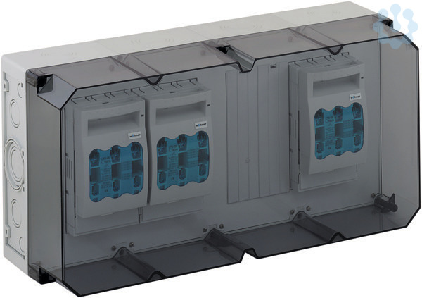 NH-Reiter-Sicherungs-Lasttrennschaltergehäuse, Industrie Qualität, 3 x NH 00-Reiter-Sicherungs-Lasttrennschalter, Bemessungsstrom 100 A, Schellenanschluss 1,5-70qmm, Abgang universal, auf Sammelschiene 5-polig, mit 5 Sammelschienenklemmen 16-70qmm, N-Klemmen 4-35qmm, PE-Klemmen 4-35qmm, mit Isolierstopfen, auf Sammelschienensystem 250 A, mit transparentem Deckel