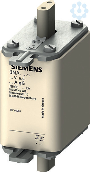 NH-Sicherungseinsatz, NH00, In: 125 A, gG, Un AC: 500 V, Un DC: 250 V, Stirnkennmelder, spannungsführende Grifflaschen NH-Sicherungssystem 3NA, 3ND für den selektiven Leitungs- und Anlagenschutz. Das NH-Sicherungssystem von Siemens als wichtiger Bestandteil der SENTRON Schutzkomponenten für die Elektroinstallation bietet effektiven Personen-, Geräte- und Anlagenschutz durch sicheres Abschalten im Überlast- und Kurzschlussfall. Im Vergleich zu Leitungsschutzschaltern können höhere Kurzschlussströme bei gleichzeitig besserer Strombegrenzung realisiert werden. Das NH-Sicherungssystem zeichnet sich vor allem aus durch: 1. Kombimelder signalisieren das Abschalten der Sicherung durch einen deutlichen Farbwechsel von rot nach weiß. 2. Mehr Sicherheit beim Wechseln durch isolierte Grifflaschen. 3. Hohe Selektivität bei niedrigen Kosten. 4. Langfristigen und sicheren Betrieb aufgrund versilberter Kontaktmesser. 5. Sicherungseinsätze von 2 A bis 1250 A und in den Baugrößen 000, 00, 0, 1, 2, 3, 4 und 4a verfügbar.