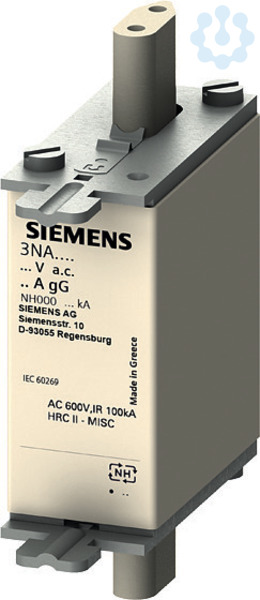 NH-Sicherungseinsatz, NH000, In: 10 A, gG, Un AC: 690 V, Un DC: 250 V, Stirnkennmelder, spannungsführende Grifflaschen NH-Sicherungssystem 3NA, 3ND für den selektiven Leitungs- und Anlagenschutz. Das NH-Sicherungssystem von Siemens als wichtiger Bestandteil der SENTRON Schutzkomponenten für die Elektroinstallation bietet effektiven Personen-, Geräte- und Anlagenschutz durch sicheres Abschalten im Überlast- und Kurzschlussfall. Im Vergleich zu Leitungsschutzschaltern können höhere Kurzschlussströme bei gleichzeitig besserer Strombegrenzung realisiert werden. Das NH-Sicherungssystem zeichnet sich vor allem aus durch: 1. Kombimelder signalisieren das Abschalten der Sicherung durch einen deutlichen Farbwechsel von rot nach weiß. 2. Mehr Sicherheit beim Wechseln durch isolierte Grifflaschen. 3. Hohe Selektivität bei niedrigen Kosten. 4. Langfristigen und sicheren Betrieb aufgrund versilberter Kontaktmesser. 5. Sicherungseinsätze von 2 A bis 1250 A und in den Baugrößen 000, 00, 0, 1, 2, 3, 4 und 4a verfügbar.