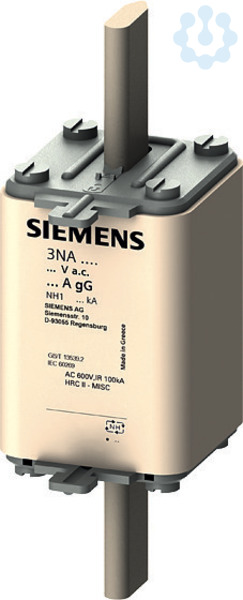 NH-Sicherungseinsatz, NH1, In: 250 A, gG, Un AC: 500 V, Un DC: 440 V, Stirnkennmelder, spannungsführende Grifflaschen NH-Sicherungssystem 3NA, 3ND für den selektiven Leitungs- und Anlagenschutz. Das NH-Sicherungssystem von Siemens als wichtiger Bestandteil der SENTRON Schutzkomponenten für die Elektroinstallation bietet effektiven Personen-, Geräte- und Anlagenschutz durch sicheres Abschalten im Überlast- und Kurzschlussfall. Im Vergleich zu Leitungsschutzschaltern können höhere Kurzschlussströme bei gleichzeitig besserer Strombegrenzung realisiert werden. Das NH-Sicherungssystem zeichnet sich vor allem aus durch: 1. Kombimelder signalisieren das Abschalten der Sicherung durch einen deutlichen Farbwechsel von rot nach weiß. 2. Mehr Sicherheit beim Wechseln durch isolierte Grifflaschen. 3. Hohe Selektivität bei niedrigen Kosten. 4. Langfristigen und sicheren Betrieb aufgrund versilberter Kontaktmesser. 5. Sicherungseinsätze von 2 A bis 1250 A und in den Baugrößen 000, 00, 0, 1, 2, 3, 4 und 4a verfügbar.