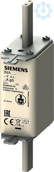 NH-Sicherungseinsatz, NH1, In: 25 A, gG, Un AC: 500 V, Un DC: 440 V, Stirnkennmelder, spannungsführende Grifflaschen NH-Sicherungssystem 3NA, 3ND für den selektiven Leitungs- und Anlagenschutz. Das NH-Sicherungssystem von Siemens als wichtiger Bestandteil der SENTRON Schutzkomponenten für die Elektroinstallation bietet effektiven Personen-, Geräte- und Anlagenschutz durch sicheres Abschalten im Überlast- und Kurzschlussfall. Im Vergleich zu Leitungsschutzschaltern können höhere Kurzschlussströme bei gleichzeitig besserer Strombegrenzung realisiert werden. Das NH-Sicherungssystem zeichnet sich vor allem aus durch: 1. Kombimelder signalisieren das Abschalten der Sicherung durch einen deutlichen Farbwechsel von rot nach weiß. 2. Mehr Sicherheit beim Wechseln durch isolierte Grifflaschen. 3. Hohe Selektivität bei niedrigen Kosten. 4. Langfristigen und sicheren Betrieb aufgrund versilberter Kontaktmesser. 5. Sicherungseinsätze von 2 A bis 1250 A und in den Baugrößen 000, 00, 0, 1, 2, 3, 4 und 4a verfügbar.