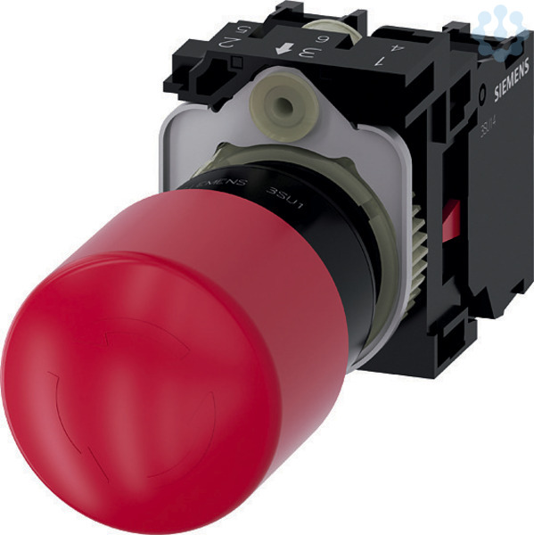 NOT-HALT-Pilzdrucktaster, 22 mm, rund, Kunststoff, rot, 30 mm, zwangsläufige Verrastung, gemäß DIN EN ISO 13850, Drehentriegelung, ohne gelbem Unterlegschild, mit Halter, 1Ö, 1Ö, Schraubanschluss NOT-HALT-Pilzdrucktaster SIRIUS ACT nach DIN EN ISO 13850 zur Steuerung von sicherheitsgerichteten Anwendungen mit Überlistsicherheit.Unter dem Markennamen SIRIUS ACT bietet Siemens ein einzigartiges Portfolio an Befehls- und Meldegeräten mit weltweiten Produkt-Zulassungen in vier modernen Designreihen aus robustem Echtmetall und hochwertigem Kunststoff.Das innovative Aufschnappkonzept vereinfacht die Montage so weit, dass dafür nur eine Hand und kein Spezialwerkzeug erforderlich ist. Als Montagebohrungen genügen nutfreie Löcher, da bereits ein 100%iger Verdrehschutz integriert ist.Dank der durchgängig hohen Schutzart sind die robusten Geräte industrietauglich und für den Außeneinsatz geeignet. Sogar die Reinigung mit Hochdruckstrahl ist möglich. Weder Staub, Öle noch aggressive Laugen können den zuverlässigen Betrie