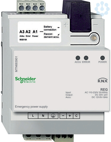 Schneider Electric KNX. Zur Pufferung der Busspannung. An die Notstromversorgung REG kann zur Pufferung bei vollständigem Netzausfall ein externer Bleigelakku mit einer Spannung von DC 12 V (SELV) angeschlossen werden. Mit der integrierten Ladeelektronik wird der Bleigelakku nachgeladen bzw. der Ladezustand erhalten. Zur Erfassung der Betriebszustände (Netzspannung, Fehlerwarnung, Akkubetrieb) kann ein Binäreingang angeschlossen werden. Für die Montage auf Hutschienen TH35 nach EN 60715. Eine Datenschiene ist nicht erforderlich. Netzspannung AC 110 - 230 V, 50-60 Hz. Ausgang zur Spannungsversorgung Ausgangsspannung DC 30 V +/-2 V. Gerätebreite 4 TE entspricht ca. 72 mm. Lieferumfang Mit Anschlussklemme und Leitungsabdeckung.