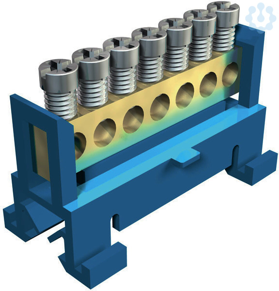 Neutralleiter- Anschlussklemme mit 7 Klemmstellen bis 16 mm². Klemmschiene Messing, Schrauben Stahl, galvanisch verzinkt und transparent passiviert, zum Aufrasten auf Hutschienen 35 mm nach DIN EN 60715 -früher DIN EN 50022- (quer) oder Flachschienen 10 x 2-2,5 mm (längs).