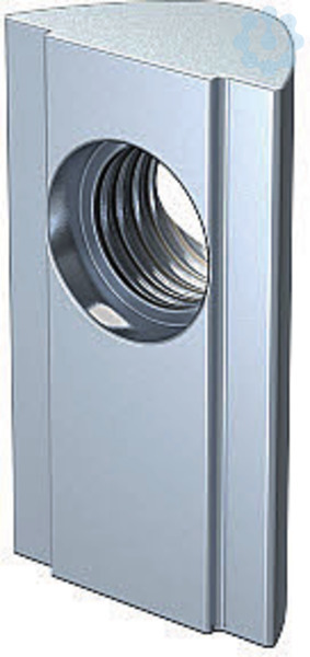 Nutenstein mit M8-Gewinde zur Montage von Anbauten und Zubehör an dem ISS-Industriesäulenprofil. Ein Druckstück an der Unterseite ermöglicht den Nutenstein selbsthaltend in die Nut einzuschwenken. Automatische Verdrehsicherung durch Profilierung an der Oberseite.