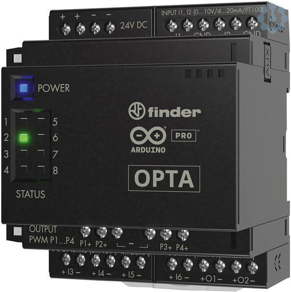 OPTA-Erweiterungsmodul, Programmierung mit Arduino IDE oder mit Arduino PLC-IDE für IEC 61131-3 Programmiersprachen (LD - SFC - FBD - ST - IL), 6 analoge Eingänge 0...10 V, 4...20 mA, PT 100, 2 analoge 0...10 V, 4...20 mA Ausgänge, 4 PWM Ausgänge, Versorgungsspannung 12?24 V DC, Schnittstelle zu OPTA PLR und Erweiterungsmodulen, insgesamt mit bis zu 5 Erweiterungsmodulen erweiterbar, Power LED und 6 LEDs für Statusanzeige der Ausgänge, 70 mm breit, für Tragschiene 35 mm (EN 60715)