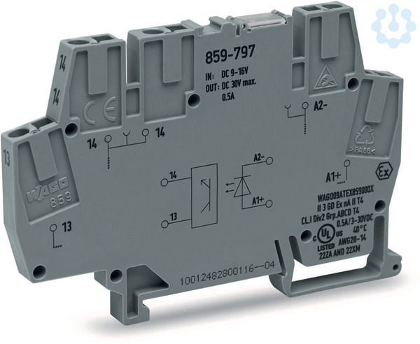 Optokopplermodul. Eingangsnennspannung DC 12 V. Ausgangsspannungsbereich DC 3 ? 30 V. Grenzdauerstrom 0,5 A. 2-Leiter-Anschluss. 6 mm Baubreite